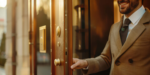 Smiling doorman opens the door to the hotel with an inviting gesture. Background for hotel service banner.