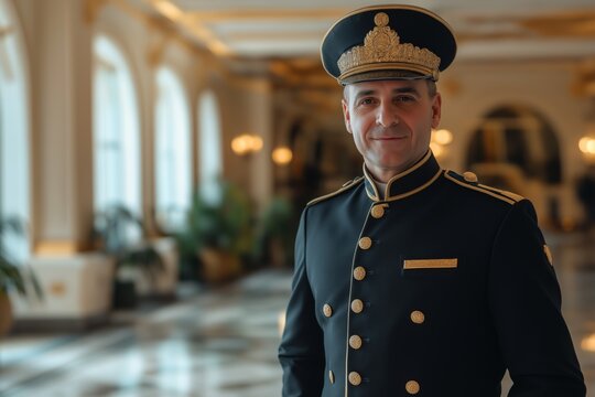 A distinguished hotel bellman in a classic uniform with gold details, standing upright near the entrance, with a blurred background of a hotel lobby