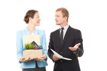 Portrait of female employee holding box with personal belongings and hr manager holding document