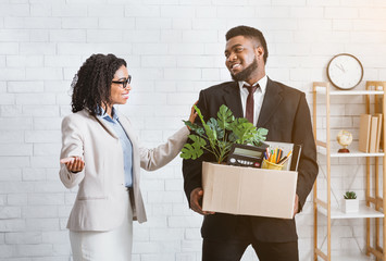 Joyful black guy with personal belongings being welcomed to work in company, meeting his new female boss