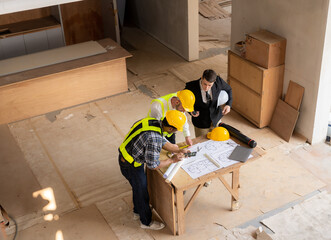 Three colleagues discussing data work and tablet Laptop with architecture project at construction site Architect team working on blueprints for architectural plans construction project engineer