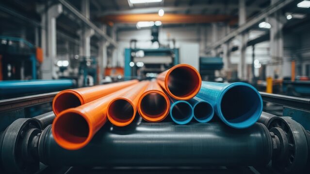 Colorful plastic pipes on a conveyor belt in a manufacturing facility, industrial setting
