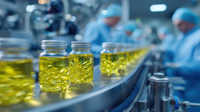 Rows of glass jars filled with yellow softgel capsules move along a manufacturing conveyor belt.