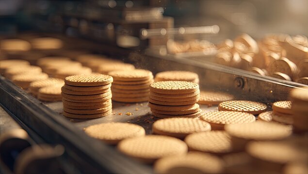 Stacked cookies on a conveyor belt in a factory