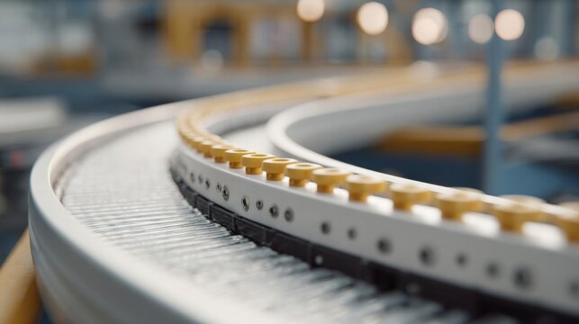 Close-up of a conveyor belt in a factory. the belt is made of metal and has a curved shape with multiple rows of yellow-colored knobs on it.