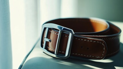 Brown Leather Belt with Silver Buckle on a Soft Surface Fashion Accessory for Mens and Women