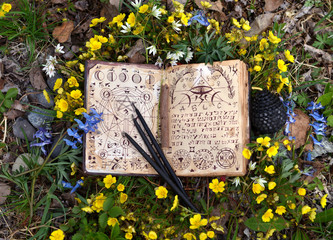 Spring flower wreath with colorful ribbons in garden, green natural background. floral decor, Symbol of Beltane, Wiccan Celtic Holiday beginning of summer. pagan witch traditions, rituals. banner