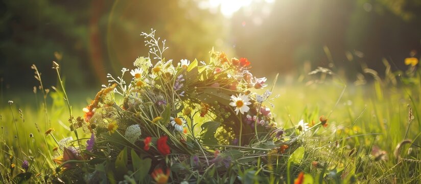 Meadow flowers woven into a wreath in a summer garden, set against a sunny natural backdrop. The floral crown represents the Summer Solstice, the Midsummer holiday,
