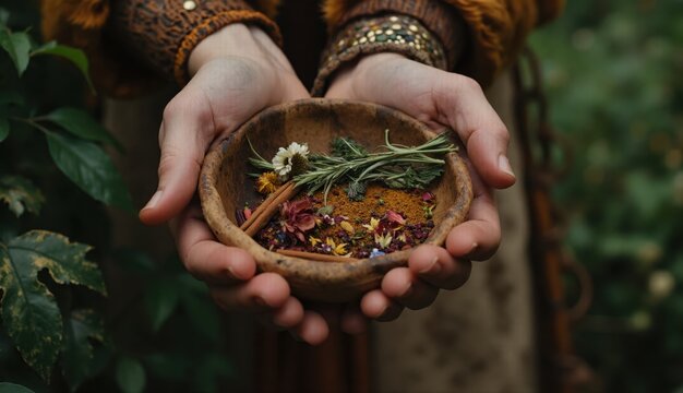 Decorating a Beltane altar with flowers, candles, and symbols of fertility,...
