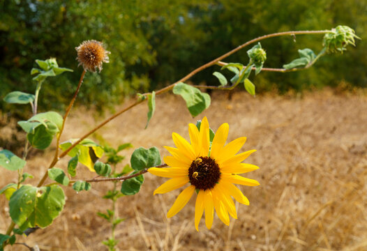A beautiful and showy Annual Sunflower or Helianthus being visited by two bees and a tiny spider on a hot and dry late summer afternoon in Benbrook, Texas