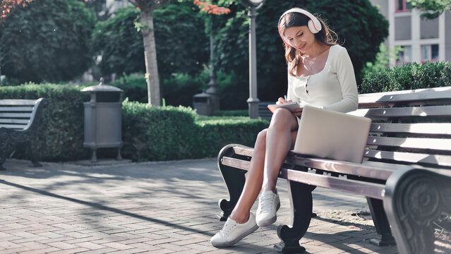 Remote learning. A smiling young woman in summer attire and wireless headphones is taking notes from a lesson displayed on her laptop into her study notebook while seated on a bench in a park