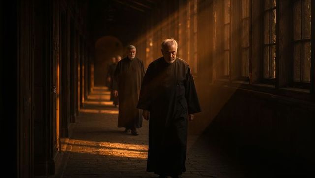 Elderly clergy walking through sunlit cloister corridor in abbey ambience at sunset
