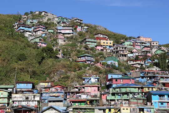 Aerial view of the colourful Stobosa hillside homes artwork in the town of La Trinidad, Benguet, Philippines.