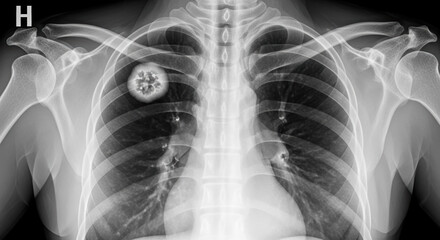 Chest x-ray showing a solitary pulmonary nodule in the lung. Radiograph of a benign tumor with popcorn calcification characteristic of a hamartoma. Medical imaging for diagnosis in radiology