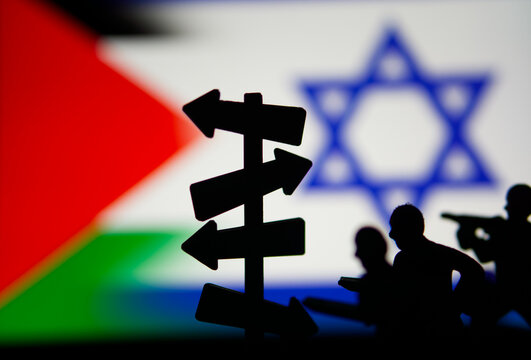 A depiction of the Israeli Palestinian conflict, represented by toy soldiers and a signpost with arrows.