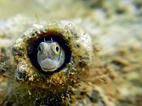 Small coral fish from the family Blennidae in a shelter on the reef, its scientific name is Lance blenny (Aspidontus dussumieri), Red Sea, Sinai, Middle East