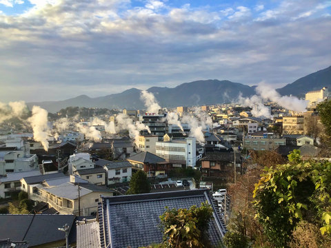 Beppu, Japan cityscape with hot spring bath houses