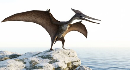 Ein majest�tischer Flugsaurier breitet seine Fl�gel auf einer Felsenklippe �ber dem Meer aus bei hellem Licht. AI Generated