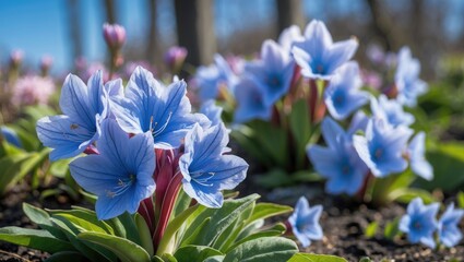 Bergenia crassifolia in spring garden. Purple flowers of bergenia