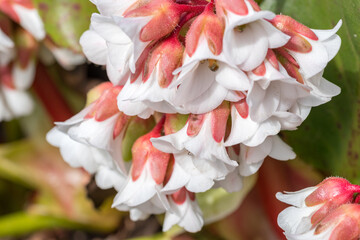 Close-up on flowers of heartleaf bergenia, Bergenia crassifolia at spring.