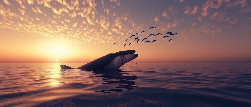 AI generator image of whale,Bryde's whale, Eden's whale in ocean ,Whale eating fish with brid flying up in the Thailand sea, Thailand Whale Tourism for geography the gulf of Thailand.