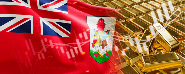 Gold bars with Bermuda flag. Chart simply precious metals stocks. National foreign-exchange reserve banking economy system. Golden reserve. 3d image