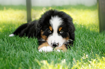 Portrait of cute bernese shepherd and little boy on the car window vacation travel