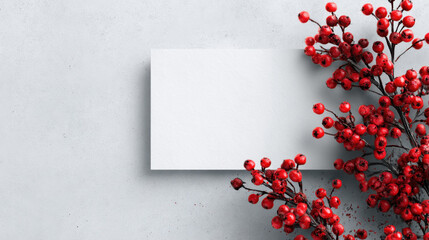 White paper card mockup red berry branch minimalist winter background, blank greeting card festive border, Christmas floral decoration design with copy space