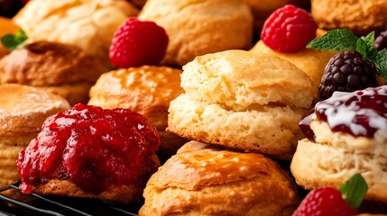 Close-up of fresh scones topped with whipped cream and berry jam, served with raspberries, blackberries, and mint leaves on a wooden board.