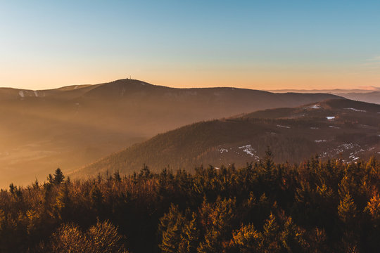 Sunset scenery on Smrk mountain in Moravskoslezske Beskydy in Czech republic with clear sky and only few clouds during late summer with Ondrejnik and Radhost