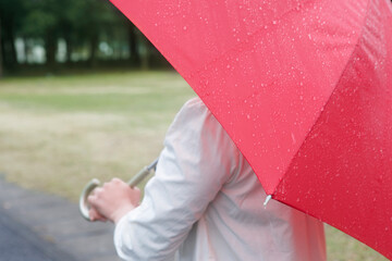 雨の日に赤い傘をさす女性