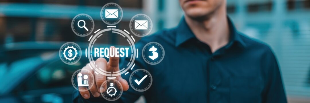 Businessman touches virtual request interface with finger, symbolizing digital interaction and modern technology