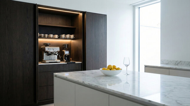 Minimalist calacatta viola marble kitchen island with wooden hockers and organic styling with magnolia flowers and apples, wabi-sabi japandi kitchen