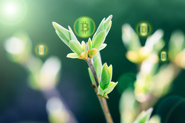 Bitcoins on sprout plant as a symbol of growth up bitcoin and crypto currency. Bitcoin sprouts in the sunlight. Plants with bitcoins, best conceptual picture of crypto currency & blockchain.