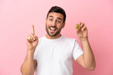 Young man holding a Bitcoin isolated on pink background showing and lifting a finger in sign of the best