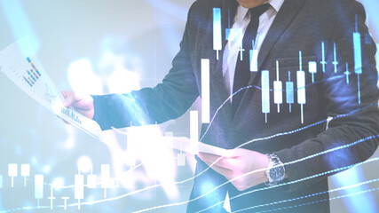 Double exposure of young business man and digital number of stock market background to represent successful in investment marketing. Find out the best solution in business and financial as concept.