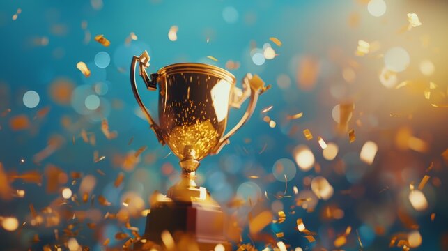 Golden trophy and streamers in sport competition with blue background.