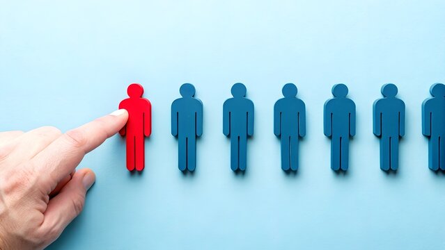 A magnifying glass focuses on a wooden figure marked with red checkmarks, signifying selection from a group of similar figures.  This symbolizes careful candidate selection or choosing the best option