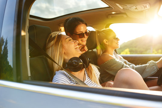 Group of best female friends travel together to summer adventure.They drives a car and making fun.