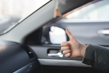 Car passenger is showing a thumbs up gesture and is satisfied by a driving of taxi driver.