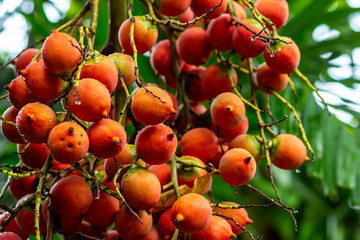 orange fruit Bethel palm, Areca catechu on a branch close-up source of paint for tissues bright colorful plant