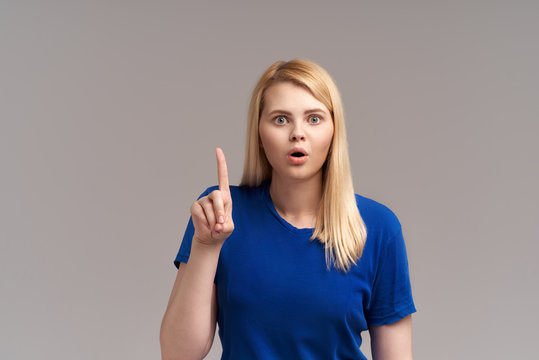 Adorable beautiful young woman gets good idea in mind how improve project, raises fore finger, wants to sound and express thoughts, has worried expression, doesn`t want to forget brilliant thought