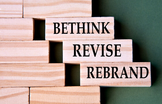 BETHINK REVISE REBRAND - words on wooden blocks on dark green background