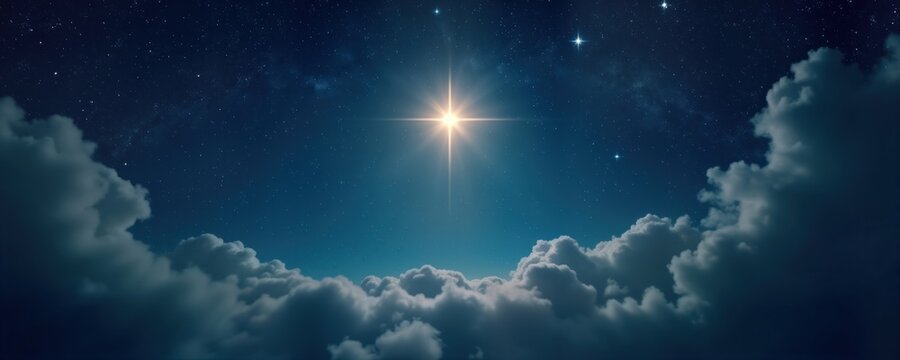 Bright star shines over dark night sky covered with clouds. Night scenery with celestial light. Image evokes Christmas nativity scene. Majestic, peaceful scene. Suitable for religious holiday themes.