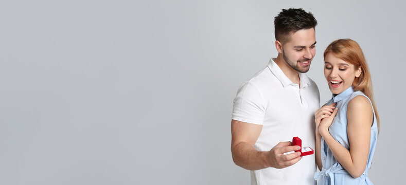 Man with engagement ring making marriage proposal to girlfriend on light grey background, space for text. Banner design