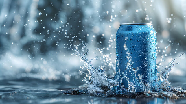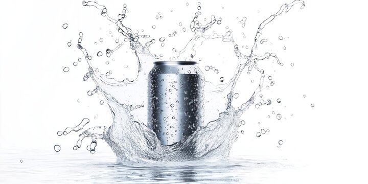 Cool drink in splashing water. Refreshing beverage in metallic surrounded by water splashes. Design mockup for drinks advertising product presentation. Isolated white background. Modern mockup for