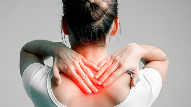 Frau mit Nackenschmerzen, Schmerzpunkt markiert, Rückansicht. Perfekt für Themen wie Gesundheit, Fitness, Physiotherapie, Schmerzmanagement und Heilung.