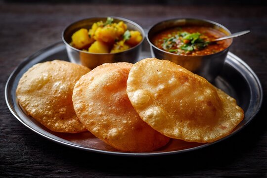 A delectable serving of indian puri bhaji presented on a silver plate, showcasing goldenbrown fried bread alongside a flavorful potato and vegetable curry, garnished with fresh cilantro