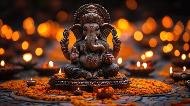 Ganesha statue, Diwali lights, India, prayer