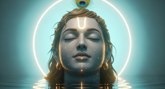 Serene Krishna portrait with glowing aura and peacock feather